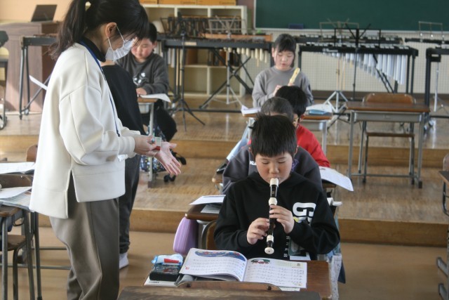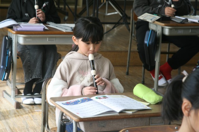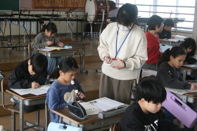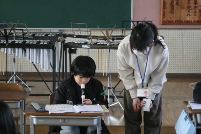 にわとりポルカ(3の2) 公開日 2026/02/10 更新日 2026/02/10 3年生 3年生の音楽の時間・・・「にわとりポルカ」の曲について、リコーダーの演奏の出来具合を、先生がチェックしていました。難しい指づかいがあって、苦戦している子もいますが、まだ中間検定です。きれいな音で演奏できるようになりたいとみんながんばっていました! +5