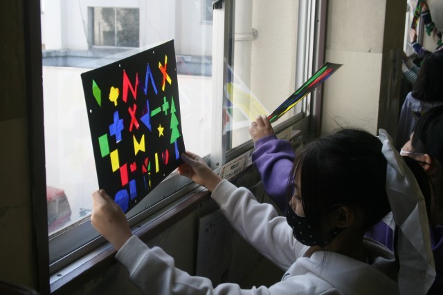 光のプレゼント(2の1) 公開日 2026/02/18 更新日 2026/02/18 2年生 出来上がった作品の鑑賞会の様子です。太陽の光にあてて、運動場の地面や校舎の壁に映し出していました。教室では、互いの作品を見合いました。 +3