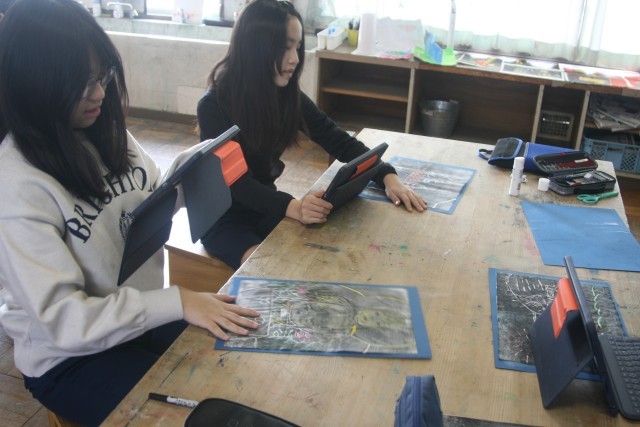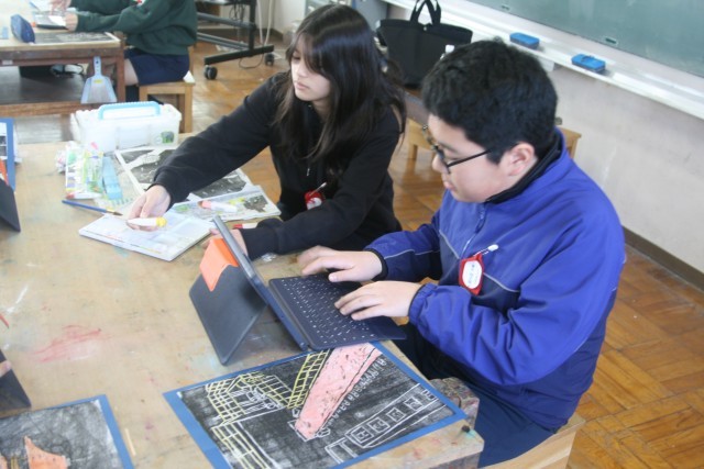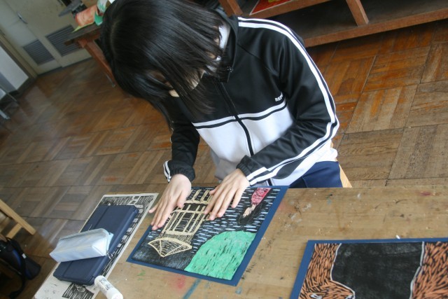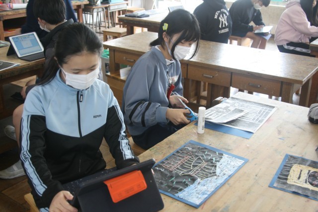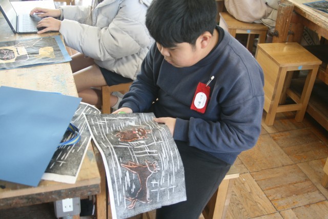 版画(6の1) 公開日 2026/02/18 更新日 2026/02/18 6年生 6年生の図工の時間・・・版画もほぼ完成しました。こだわってもう少し色をつけている子もいました。完成した子は、きれいに切り取って台紙に貼ったり、タブレットで、自分の作品のおすすめポイントや 友達の作品のいいところを文章にしていました。 +5