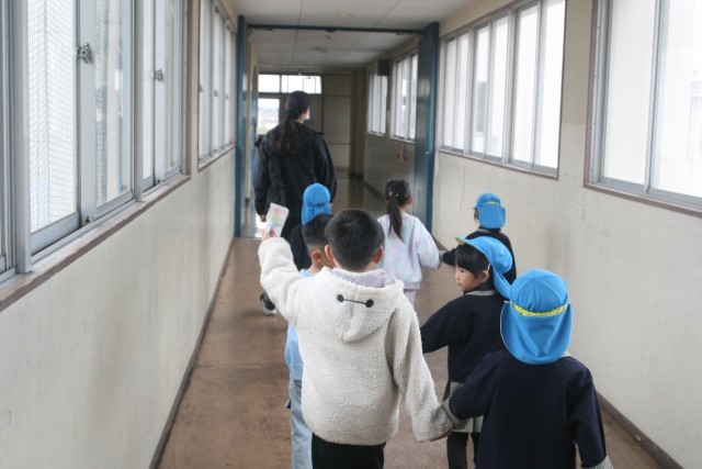 まさみ幼稚園年長さんとの交流会(1年生) 公開日 2026/03/03 更新日 2026/03/03 1年生 1年生が、まさみ幼稚園の年長さんを迎えて、交流会を行いました。来校した年長さんは、とてもお利口で、静かに待っていたので、かっこいいお兄さん、お姉さんになりたい1年生も負けじと、いつもより数倍素敵でした。手をつないで学校を案内してあげました。4月に入学してくるのを楽しみに待っていますよ。 +2