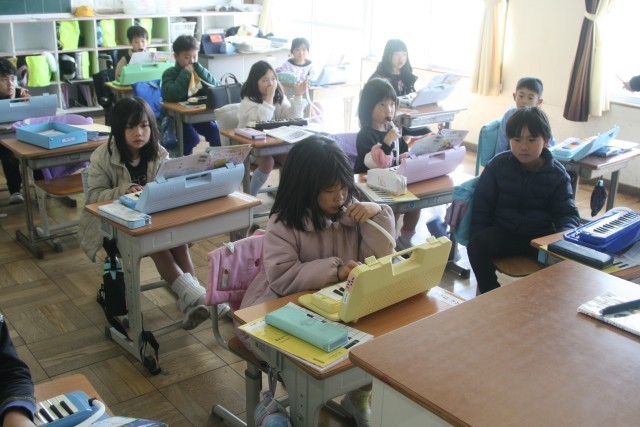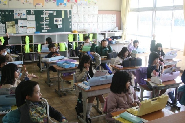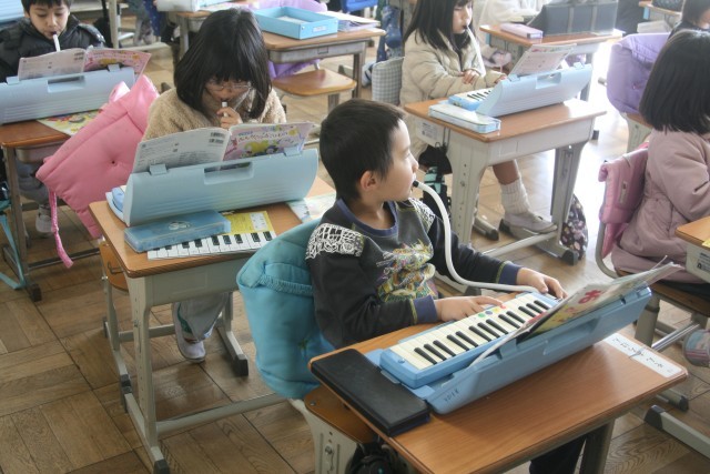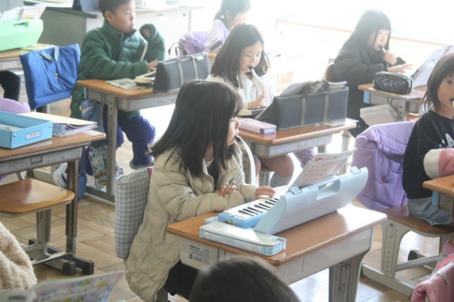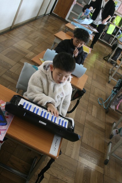 つくったせんりつのリズムをかえよう(1の1) 公開日 2026/03/05 更新日 2026/03/05 1年生 1年生のおんがくのじかん・・・けんばんハーモニカで、「つくったせんりつのリズムをかえよう」にとりくみました。みみで しっかり おとをききとって ひいていました。じぶんのつくったせんりつを ひくのはできますが、リズムをかえることが ちょっとむずかしそうです。じょうずにリズムを かえることができた子のえんそうをみんなで きいています! +5