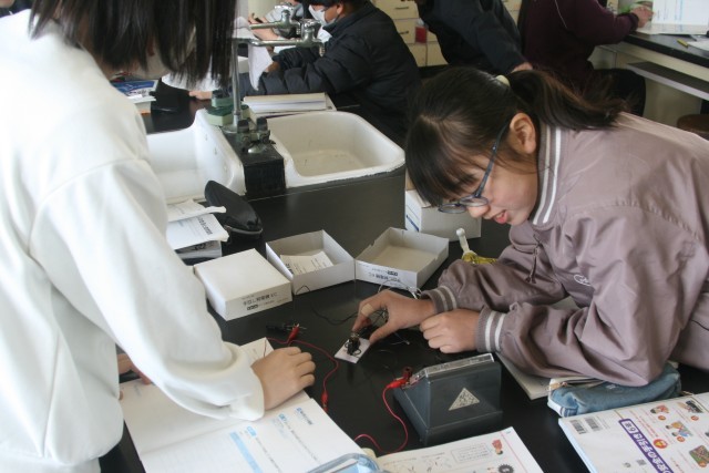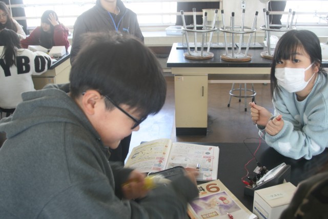 豆電球と発光ダイオードの実験(6の1) 公開日 2026/03/09 更新日 2026/03/09 6年生 6年生の理科の時間・・・「豆電球と発光ダイオードは何が違うのか調べよう」という実験をしました。手回し発電機と、電流計を使って、光の強さや使う電気の量を測定していました。手回し発電機をしゃかりきに回している子、結果をきっちりと記録している子、回路を作って、電流計の針を読んでいる子・・・協力して実験をしていました! +5