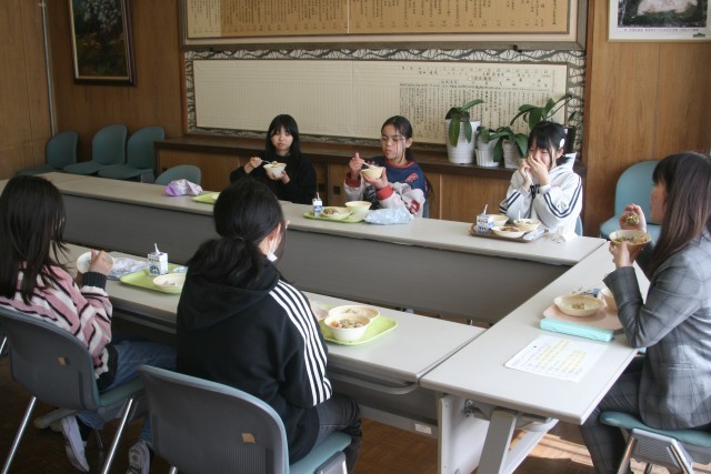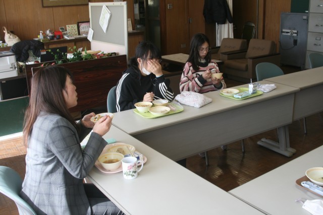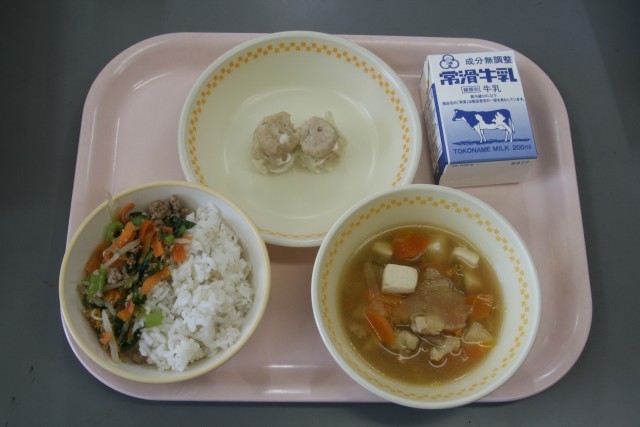 今日の給食 公開日 2026/03/11 更新日 2026/03/11 給食 〔献立〕567kcal〇麦ご飯〇牛乳 〇おからと大豆のしゅうまい 2こ〇ビビンバ〇ピリ辛汁6年生が、校長先生と一緒に給食を食べる企画『校長室ランチパーティー』の4日目、今日は、女子5名がやってきました。小学校生活で、一番心に残っていることは?-修学旅行!校長先生からの質問に、一人ずつ思いの丈を話していました。 +1