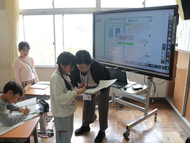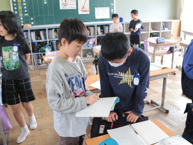 整数と小数(5の1) 公開日 2026/04/13 更新日 2026/04/13 5年生 5年生の算数の時間・・・「整数と小数」について学習しました。問題:63.4を10倍や1/10にした数について調べ、3人以上に説明しよう!問題を解くだけでなく、「友達に説明する」ミッションが加わったので、忙しく動き回っていました。自分の中で、しっかり理解できていないと、うまく説明できないから大変です。 +2