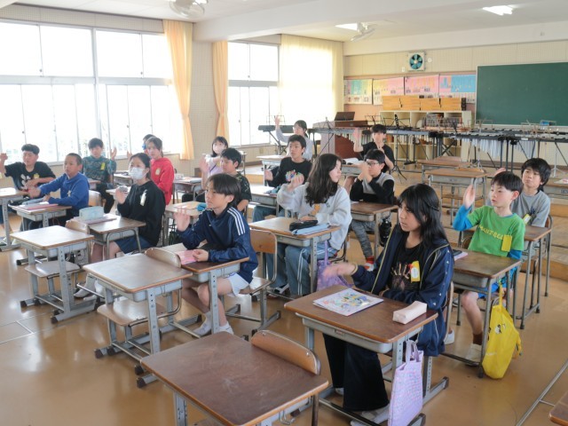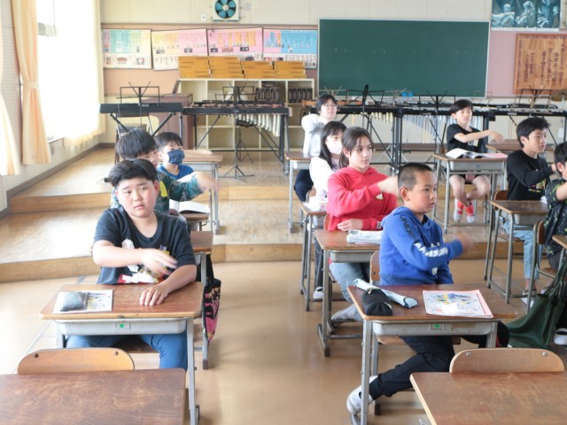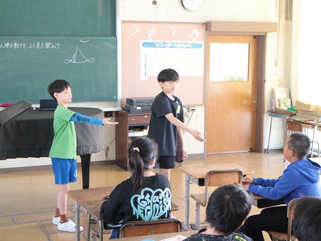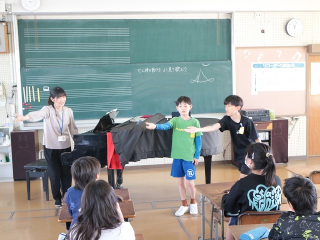 「せん律の動きをよく見て歌おう」の めあてのもと、