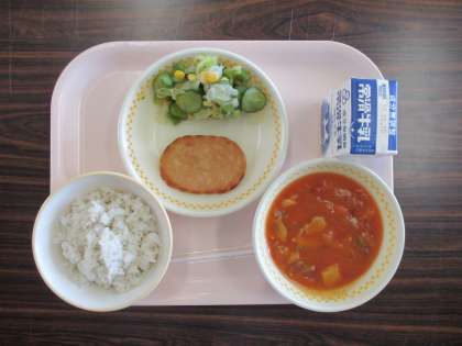 5/8(月)今日の給食 公開日 2023/05/08 更新日 2023/05/08 給食 [献立]630Kcal ○麦ご飯 ○牛乳 ○ハヤシライス ○チキンハムステーキ ○アスパラサラダ(卓上イタリアンドレッシング)