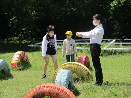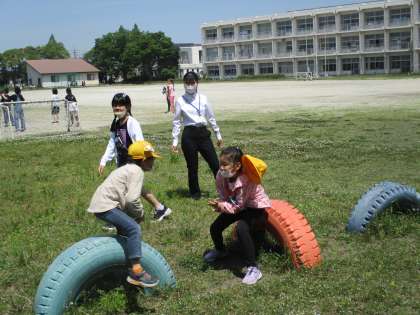 「学校体験活動」として学生が来ています。休み時間には、運動場に出て、子どもたちと遊んでいます。