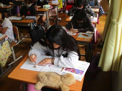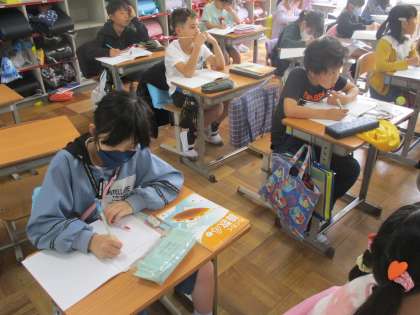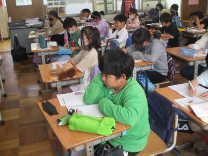 わり算の筆算のやり方を学習しました。やり方についての説明を聞いた後、ノートに書いています。