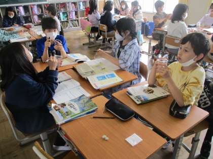 発芽の様子を観察するため、その準備をしています。水ありとなし、空気ありとなし、冷蔵庫に入れる、入れない、と条件を変えたものを用意しています。