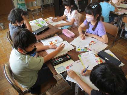 歌詞を読んで、1,2,3番それぞれを、どんな強さで歌ったらよいか、話し合っています。