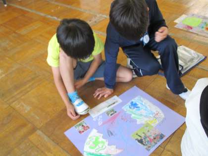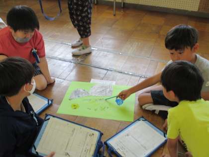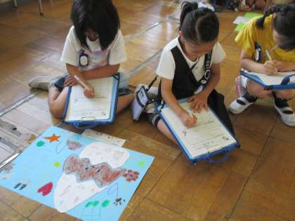 ふしぎなたまごの絵が完成したので、最後に鑑賞会をしていました。友達の作品を見て、に「いいね!」と感じたり気づいたりしたところを鑑賞シートに書いていました。