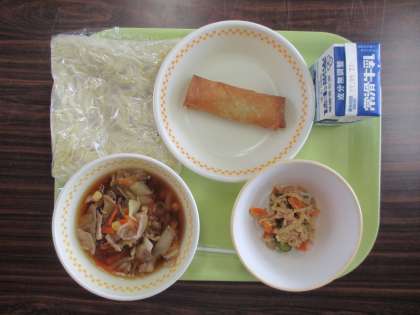 5/19(金)今日の給食 公開日 2023/05/19 更新日 2023/05/19 給食 [献立]669Kcal ○中華麺 ○牛乳 ○たまり醤油の五目かけ汁 ○愛知のしそ入り春巻 ○切り干し大根の中華和え