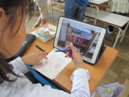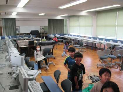 コンピュータしつ、わくわくひろば、はいぜんしつにいきました。じゅぎょうちゅうのいどうのしかたもじょうずになってきました。きょうしつにもどると、かあどに きづいたことをかきました。