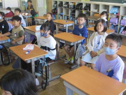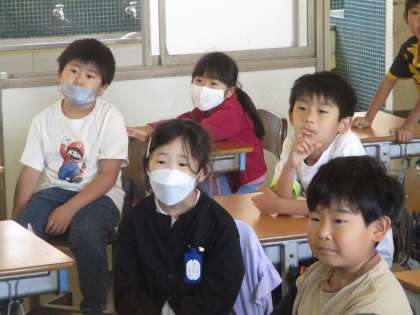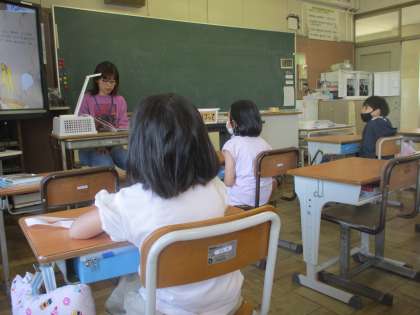 おはなし広場の方による読み聞かせがありました。電子黒板に映し出された絵を集中して見ています。