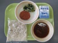 [献立]644Kcal ○ご飯 ○牛乳 ○ぶりの竜田揚げ ○小松菜のナムル ○なす入り麻婆豆腐