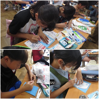 9/6(金) 小物作り(5の1) 公開日 2024/09/06 更新日 2024/09/06 5年生 フエルトで小物を作り始めました。「ティッシュ入れ」か「カードケース」のどちらかを作るようですが、中には、アレンジしようと考えている子もいました。