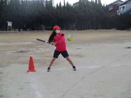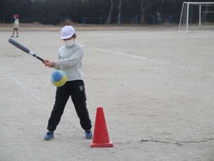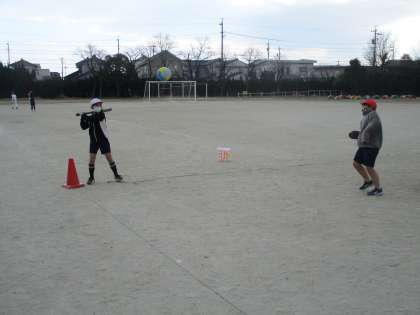 バットでボールを打ち、得点を取るゲームです。守備のいないところに上手に打てるとよいですね。
