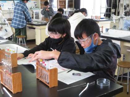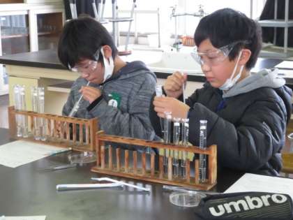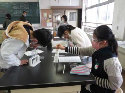 この水溶液は何?(6の1) 公開日 2023/02/13 更新日 2023/02/13 6年生 5種類の水溶液があります。リトマス紙に水溶液をつけたり、息を吹き込んだりして、どんな水溶液なのかを調べています。危険防止のためにゴーグルを付けています。