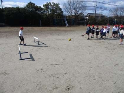 体育の授業でボール蹴りを行っています。ボールの先にはハードルでミニゴールが作ってあり、距離も3種類用意されています。さあ、どのレベルまでクリアできるかな。