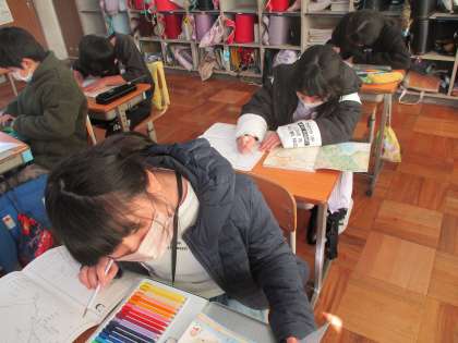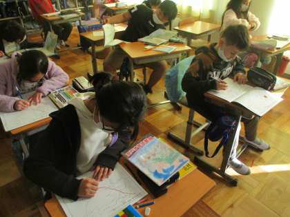 作業帳を使って、これまで学習した内容をまとめました。地図に着色したり、図表の中に用語を書き込んだりしています。