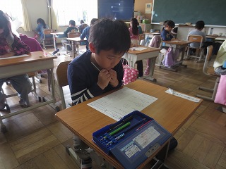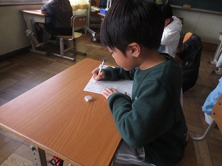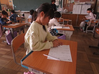かんじのテストをしています。とめ、はね、はらい・・・、みんな気をつけて書けているかな?