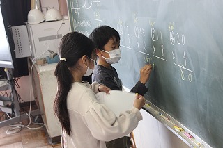 かけ算のひっ算にちょうせんしています。一の位の数にかけて、次に十の位の数にかけて・・・。先生オリジナルの追加の問題にも取り組んでいます。