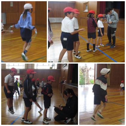 なわとびの個人種目に挑戦です。30秒で何回とべるか、友達に数えてもらっていました。終わったら、跳んだ回数を先生に報告です。記録は伸びてきたでしょうか。