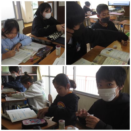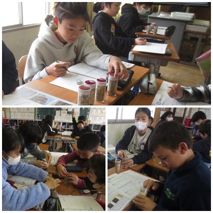 地層の一段ごとの層はどんなものでできているか、を地層のサンプルで調べました。砂や石の粒の大きさ、色、手触りなど、観察していました。
