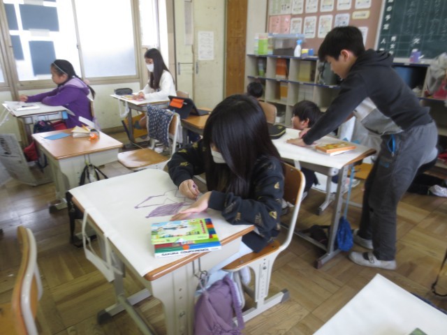 3/3(月) 思い出バッグづくり(3の2) 公開日 2025/03/03 更新日 2025/03/03 3年生 1年間の作品などを入れるバッグにお気に入りの絵を描いていました。のびのびと大きな画面に絵を描くことを楽しんでいました。 +3