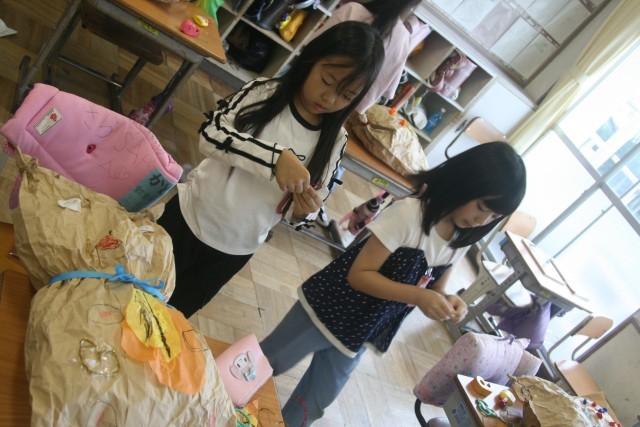 くしゃくしゃ ぎゅ!(2の2) 公開日 2025/06/04 更新日 2025/06/04 2年生 紙ぶくろにくしゃくしゃにした新聞紙をつめこんで、ひもやリボンでぎゅ!耳や、しっぽ、足もできるかな? 動物や魚など思い思いに作っていました。目をつけると、表情がいきいきとしました。飾りをつけて、完成も近いかな? +3