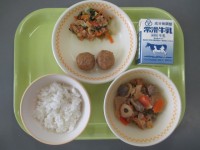 〔献立〕590kcal〇麦ご飯〇牛乳 〇肉ひじきご飯の具〇ちくわの米粉磯...