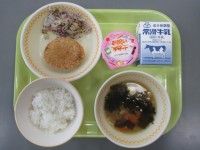 〔献立〕597kcal〇ご飯〇牛乳 〇米粉コロッケ〇キャベツの赤じそ和え〇実だく...