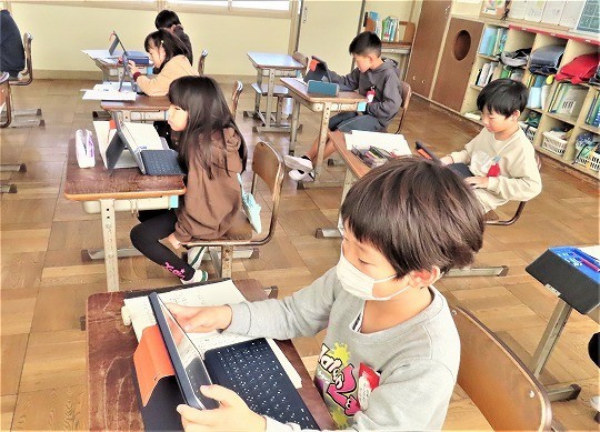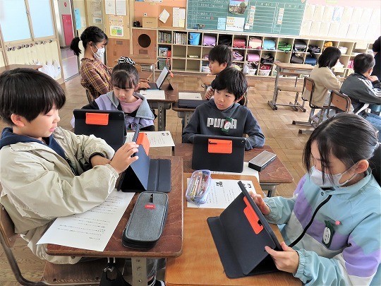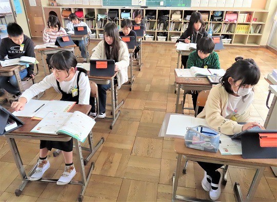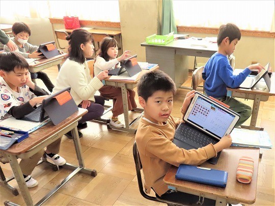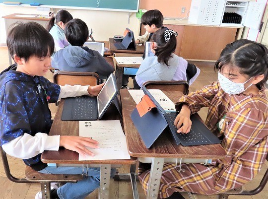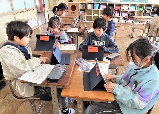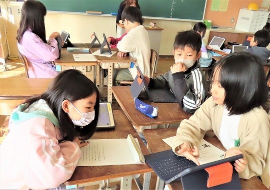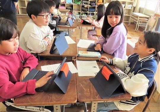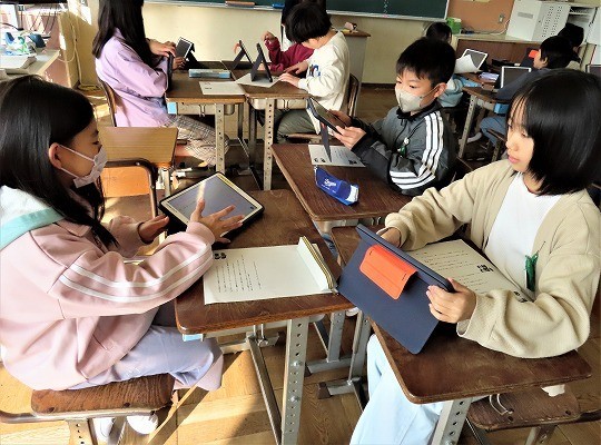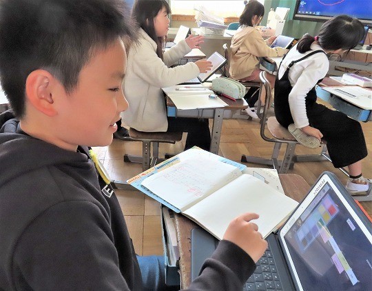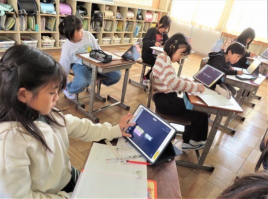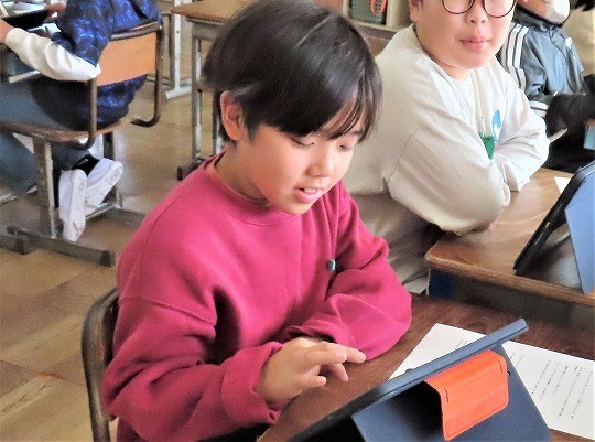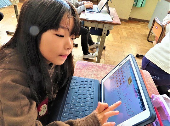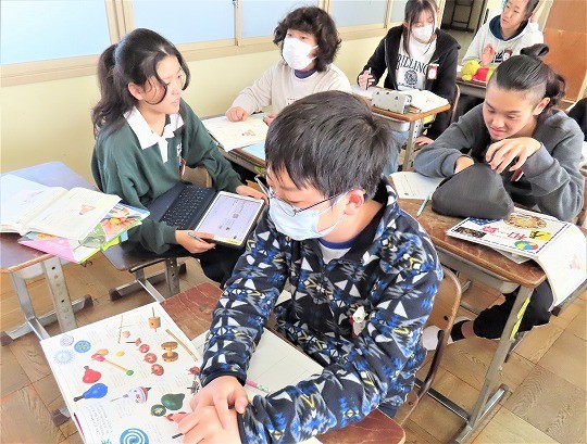 自分の作品の工夫したところをタブレットで打ち込み、皆で共有して、友だちの作品のよいところについてコメントし合っていました。