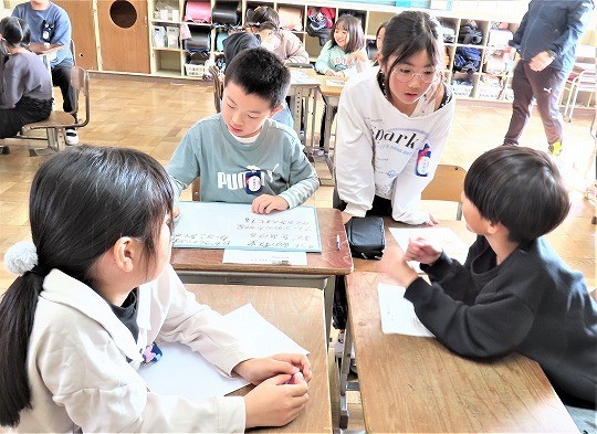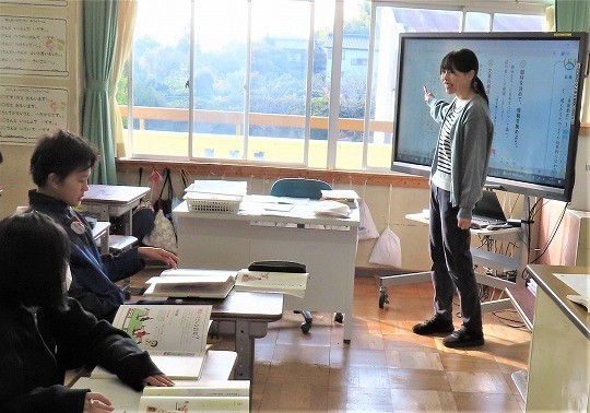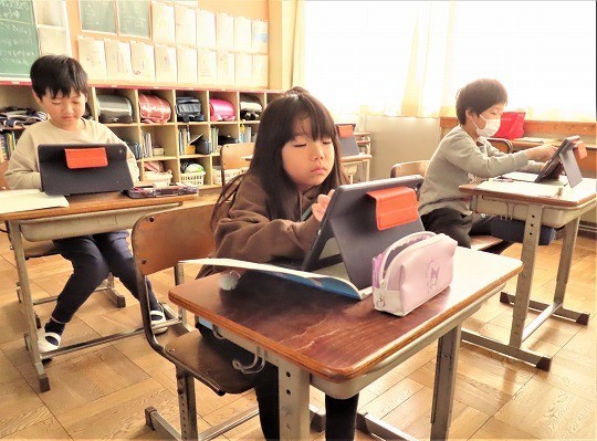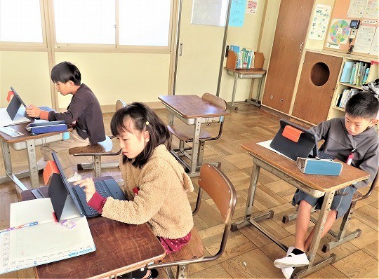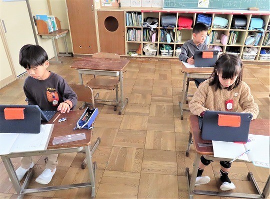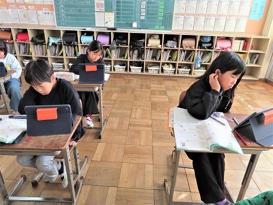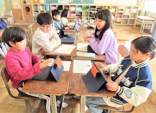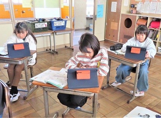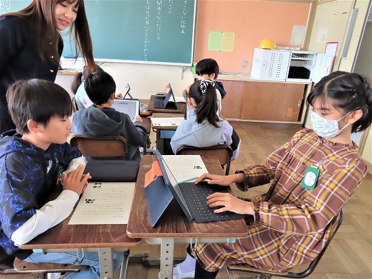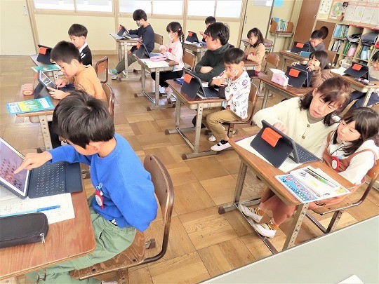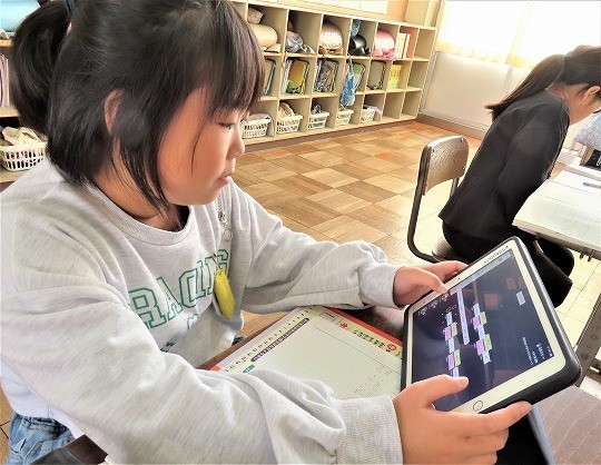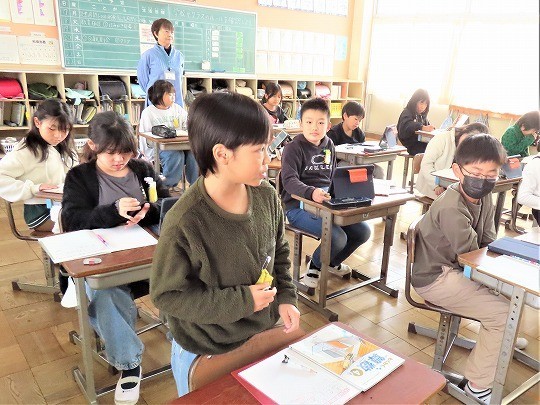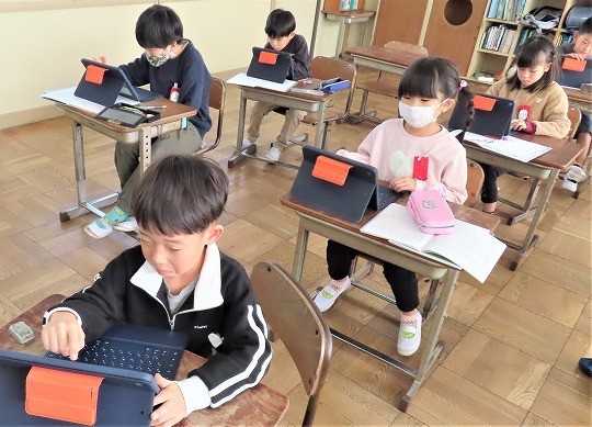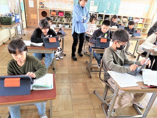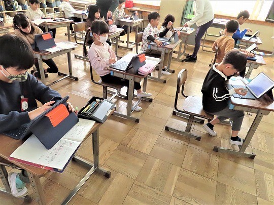 自分の作品の工夫したところをタブレットで打ち込み、皆で共有して、友だちの作品のよいところについてコメントし合っていました。