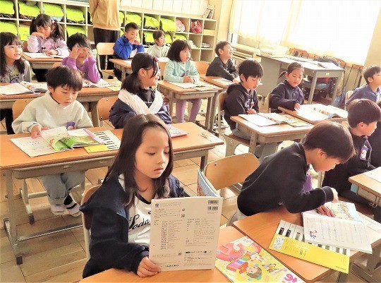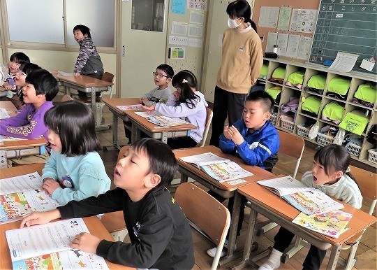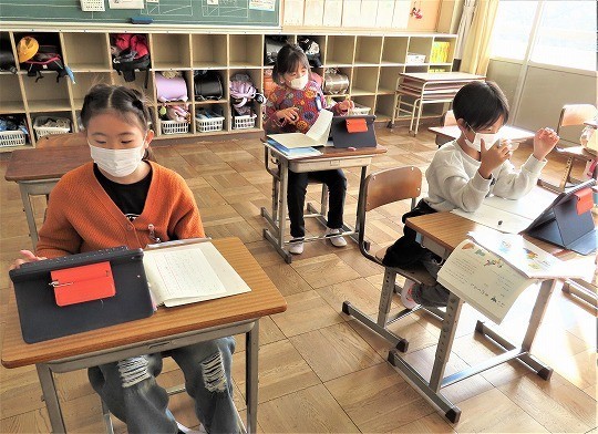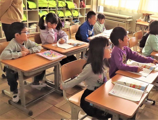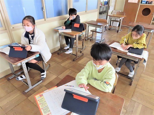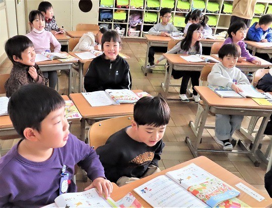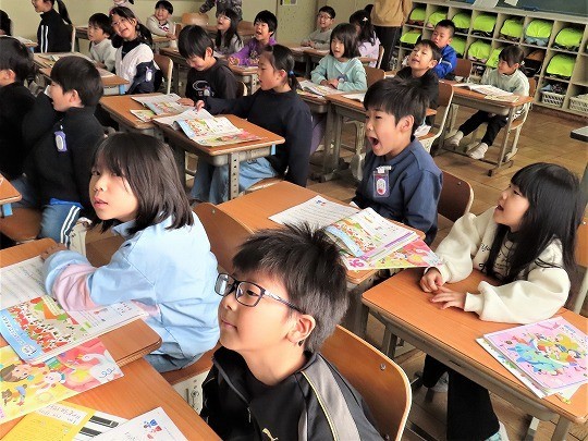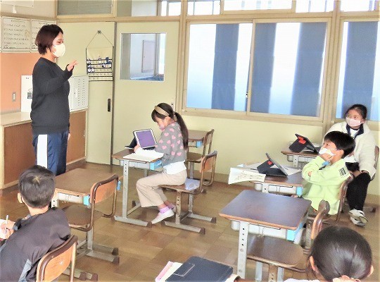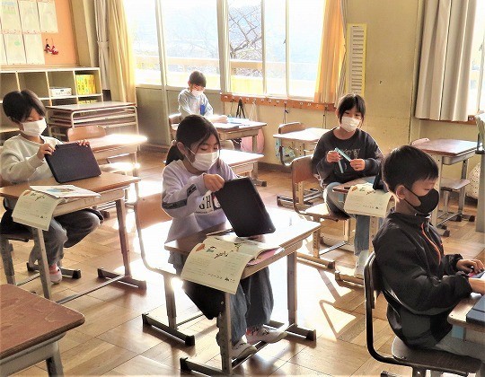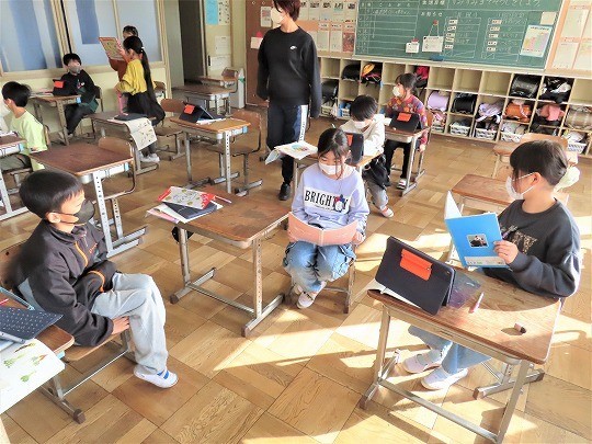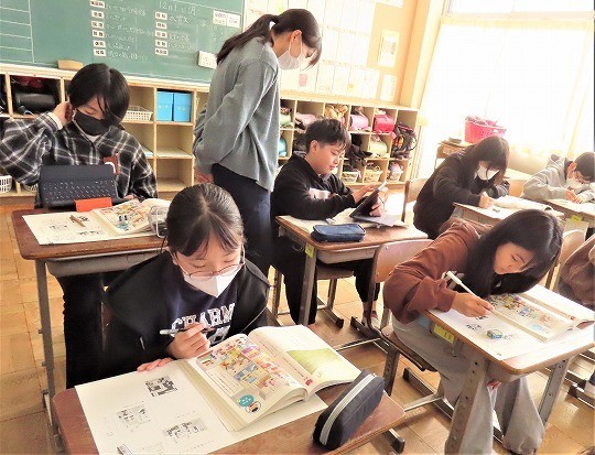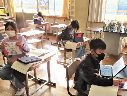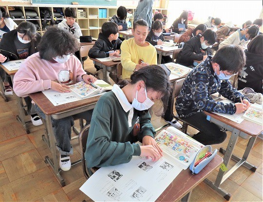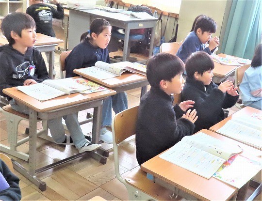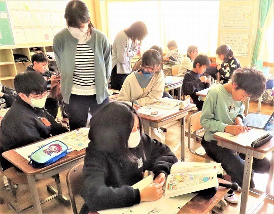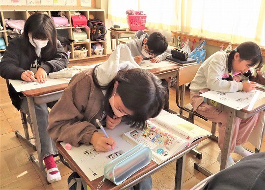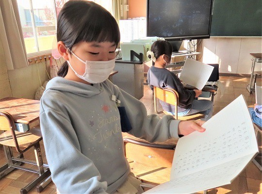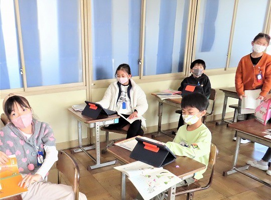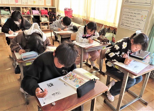 「ストーブ、雪がっせん、大根」など、身の回りで見つけた冬らしさを感じる言葉を使って文章をつくり、発表し合っていました。