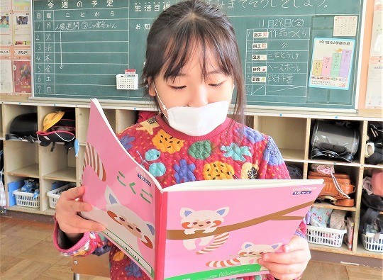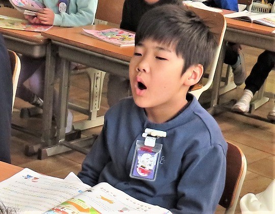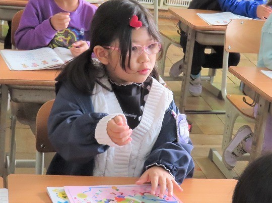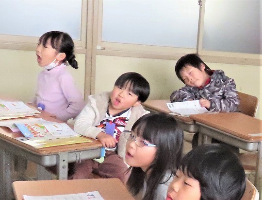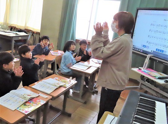 1年生の音楽は、「フルーツケーキ」「ねこのはなし」「わくわくキッチン」「たきび」などを歌っていました。
