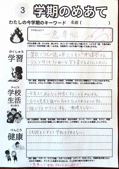 めあてをもって毎日の生活に取り組み、中学生になる力を蓄えられるとよいです。