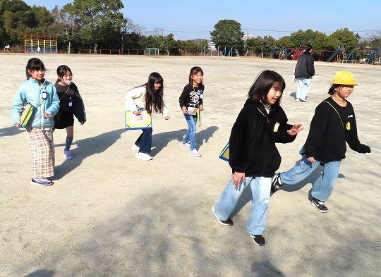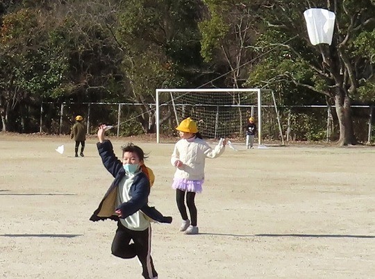 1年生は生活科の時間に運動場に出て、凧あげをしていました。