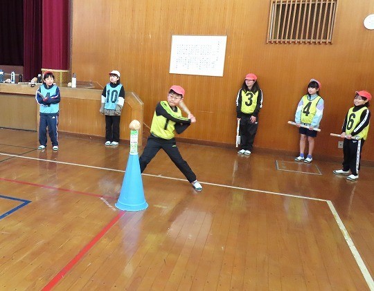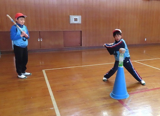 新聞紙で作ったボールとバットを使って、進め方を確認しながらゲームを楽しんでいました。