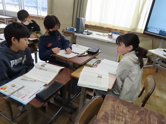 文章の大まかな内容を捉え、グループで話し合って、全体を3つのまとまりに分けていました。