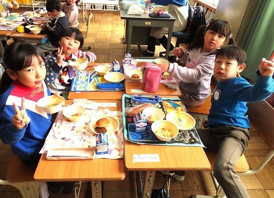 給食の時間に4年生が、メディアスFM「学校の昼休み中継」の取材を受けました。