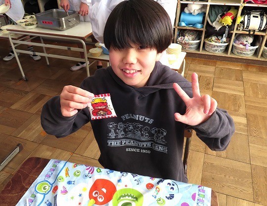 今日のメニューは、ご飯、牛乳、揚げイワシのたれかけ、小松菜のごま和え、沢煮椀、節分豆でした。