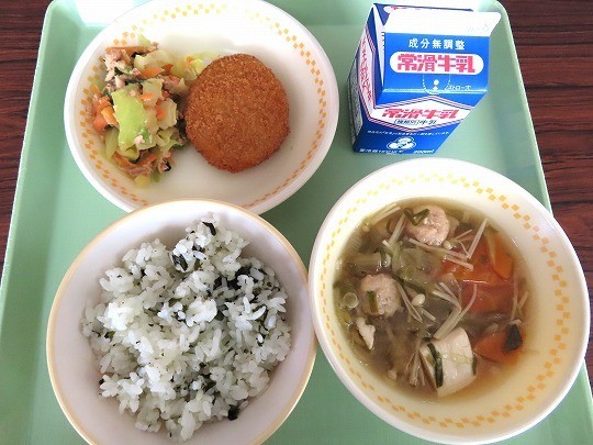 今日のメニューは、わかめご飯、牛乳、コロッケ、野菜とツナの和え物、鶏団子汁でした。