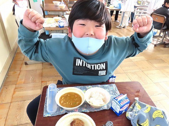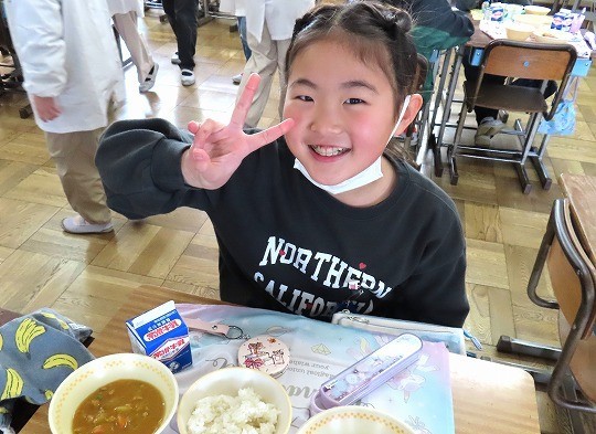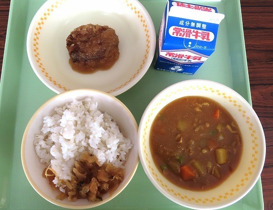 今日のメニューは、麦ご飯、牛乳、米粉のカレーライス、ハンバーグのおろしあんかけ、福神漬けでした。