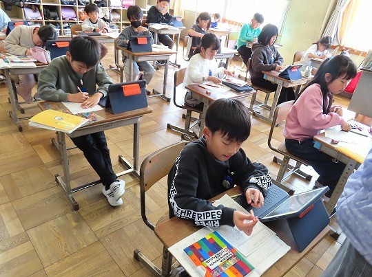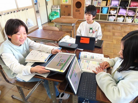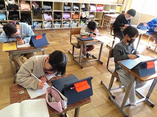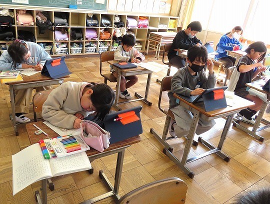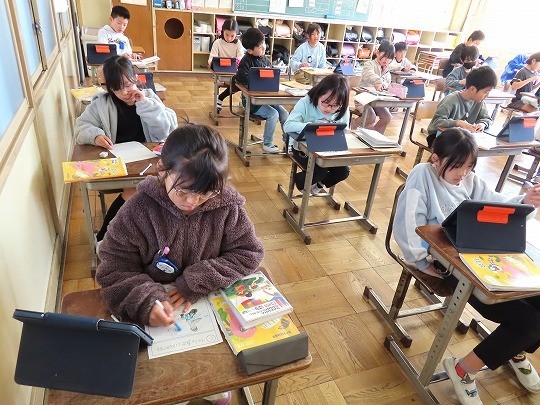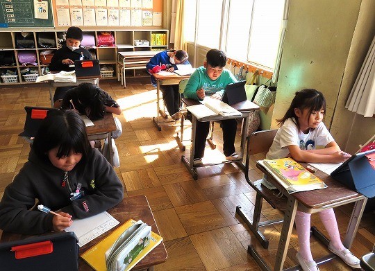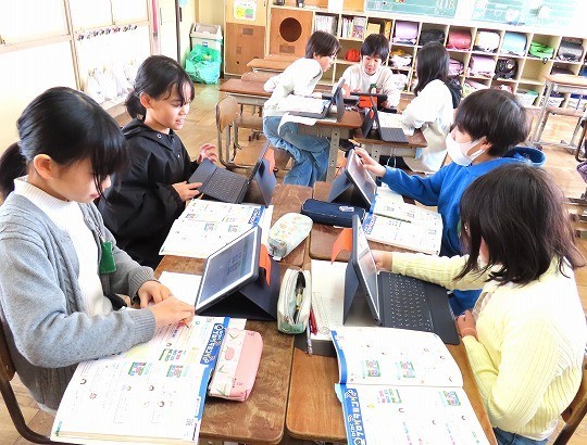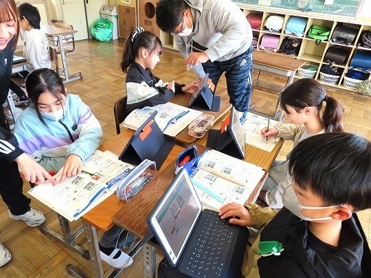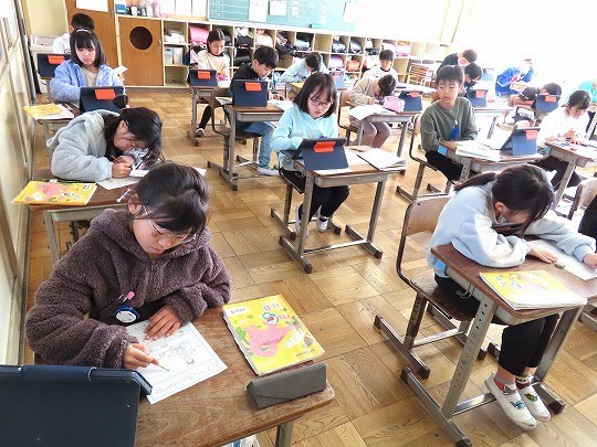 問題が解けた児童から、担任のチェックを受け、eライブラリの問題へと進んでいました。