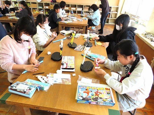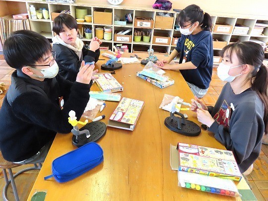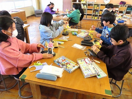 2年生の図工は、「とびだせ ぴょーん」の作品づくりをしていました。