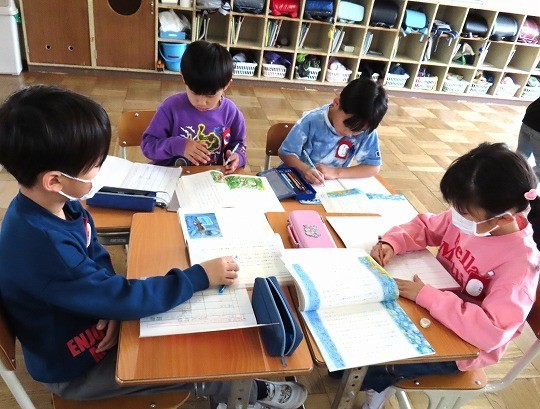 今日は「く」です。空書きをして、「くし、くま、くじら、くだもの」など「く」から始まる言葉を書く練習をしていました。
