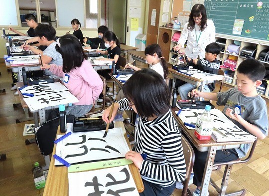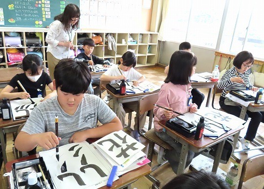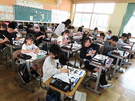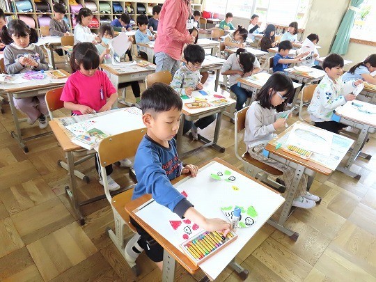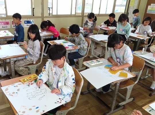 初めて絵の具を使う学習です。水の量を調整しながら、絵の具で模様をかく練習をしていました。