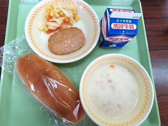 今日のメニューは、ご飯、牛乳、キャベツ入りメンチカツ、野菜とツナの和え物、けんちん汁でした。