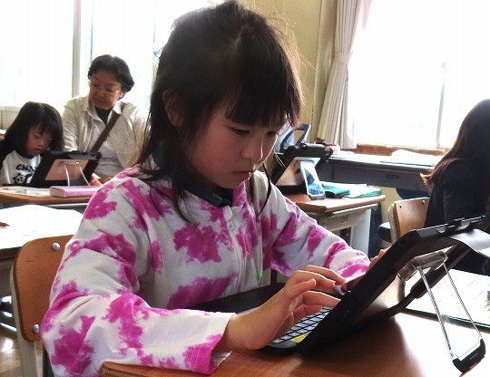 愛知県の地形についてタブレットを使って調べ、わかったことを発表していました。